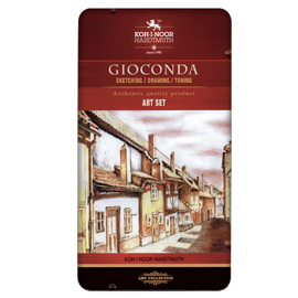 Astuccio in metallo contenente: 1 matita Progresso 6B, 1 matita “Negro”, 1 matita carboncino, 1 matita creta bianca, 1 matita creta sanguigna, 1 matita creta seppia scura, 1 creta grigia, 1 creta sanguigna, 1 sfumino diam. 7mm, 1 gomma pane.