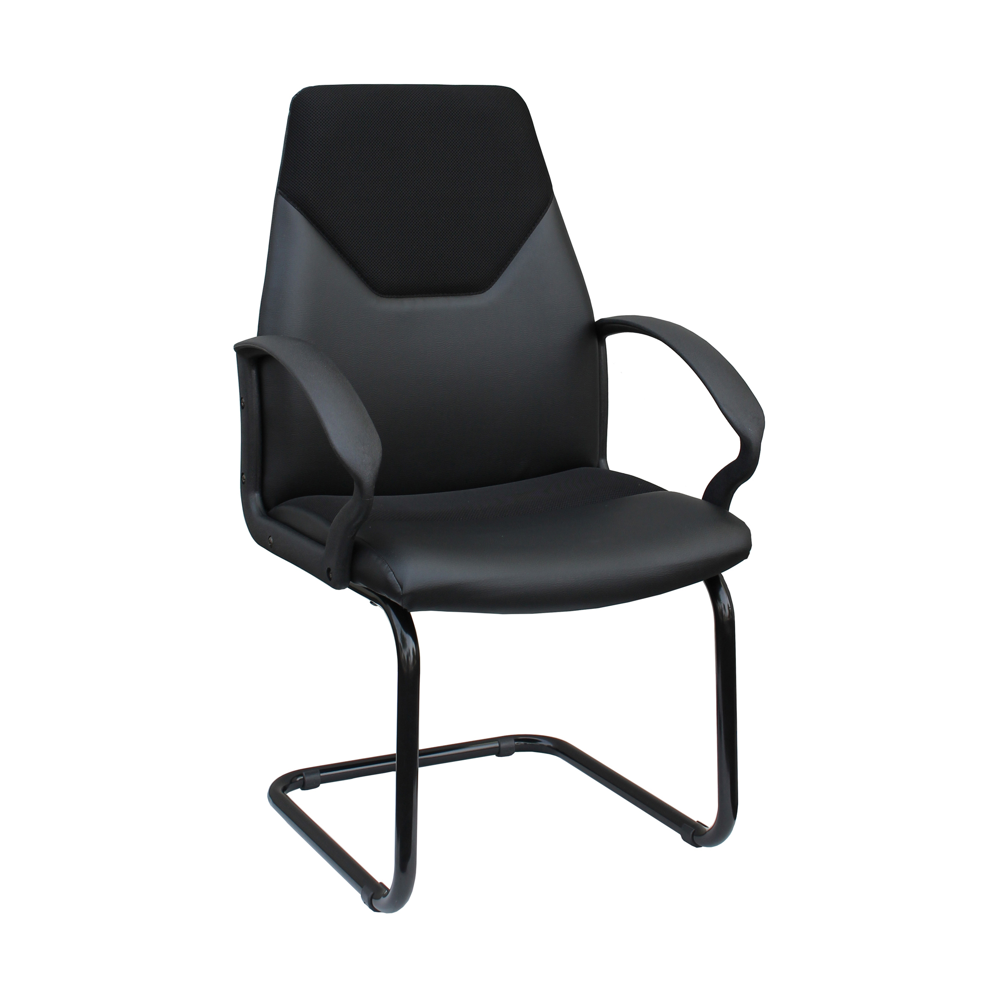 Poltrona in similpelle nera e tessuto poliestere con schienale medio. Braccioli in nylon e base a slitta in acciaio tubolare.