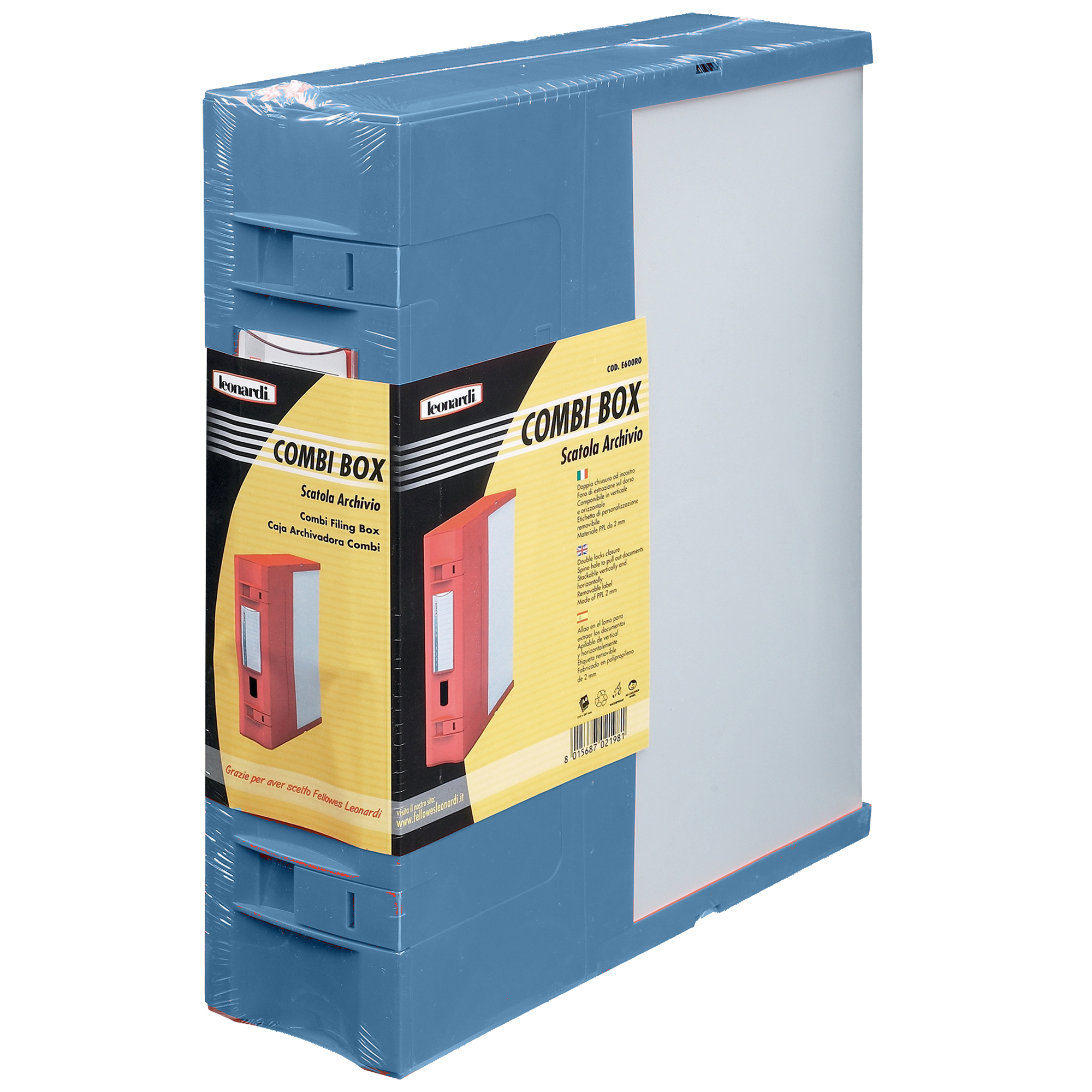 Scatole archivio Combi Box E600 realizzata in Trilex (materiale a tre strati che garantisce lunga durata, leggerezza, rigidità, robustezza ed eleganza). Parte colorata realizzata in polipropilene spessore 2mm. Lentino porta etichetta trasparente sul dorso. Componibile, anche con la E500, sia orizzontalmente sia verticalmente grazie alle clips in dotazione. Chiusura patelle retraibili. Formato utile: 29,5×35,8cm.
