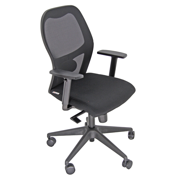 permanente – schienale con supporto lombare regolabile – sedile intercambiabile con traslatore;. Schienale in rete portante e sedile in memory foam con rivestimento in tessuto “PLUS – Ignifugo standard” 100% fibra modacrilica e reazione al fuoco classe 1. Base in nylon, braccioli regolabili. Elevazione a gas. Altezza totale: 102-113cm; Profondità totale: 68cm; Altezza seduta: 42-54cm; Larghezza sedile: 51cm; Larghezza sedile con braccioli: 66cm.